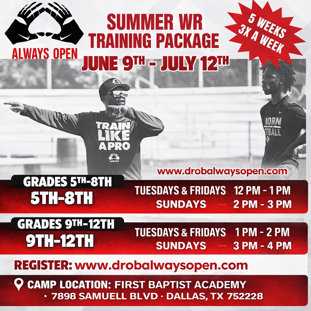 camps CAMP REGISTRATION Categories: All Youth Training NFL Training Personal Fitness All Youth Training NFL Training Personal Fitness Always Open WR Skills Training March Dates $85.00 View Options Always Open WR Skills Training February Dates $85.00 View Options Always Open Personal 1:1 Training Package (6 sessions) $650.00 Add To Cart Added! Film Evaluation $750.00 Add To Cart Added! Recruiting Assistance $750.00 Add To Cart Added! D. ROB FITNESS CAMP $100.00 Add To Cart Added! ONLINE PERSONAL TRAINING $100.00 Add To Cart Added! Personal Training package $650.00 Add To Cart Added! Personal Training 1 on 1 $100.00 Add To Cart Added! Always Open Summer WR training package $700.00 Middle School High School Add To Cart Added! 6 MONTH PLAN WIDE RECEIVER PACKAGE $278.00 every month for 6 months View Options 3 MONTH PLAN WIDE RECEIVER PACKAGE $278.00 every month for 3 months MS HS Subscribe Added! Private WR Training $250.00 Add To Cart Added! Always Open Online WR Training $120.00 Add To Cart Added!